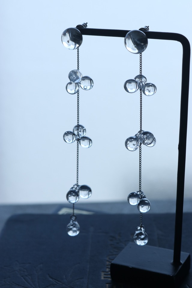 ─ 冬雨 ─ とうう 冬の雨は 冷えた空気を 撫でるように 静かに 冷たく 降ってくる 音を持たない その雫は 光だけを抱え 形を 決めきらないまま 地面へと 落ちていく 雪に 変わることもあれば ただ 雫だけが 落ちるときも 。 すべて 手作業で焼き上げた ガラス粒だけを 用いて 火と時間が残した 光の揺らぎを そのまま 連ねました 均一ではない透明、 わずかな歪みや 気泡が 冬雨の気配となって 耳元に とどまります 凛として やさしく 余韻をまとうための 冬雨のデザイン 静かな季節の 静かなアクセサリー 身につける人の輪郭を そっと際立たせる 主張しすぎない美しさを 纏うための 冬の アクセサリーです size トップのみ 9mm (1g) チャームつき 1.2cm (4g)
